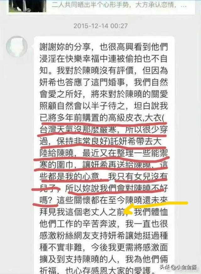 有意思的是,信息的结尾,陈妍希爸爸透露,陈晓和陈妍希公开恋情后,至今都没有拜访他们,很明显,不太尊重他们。